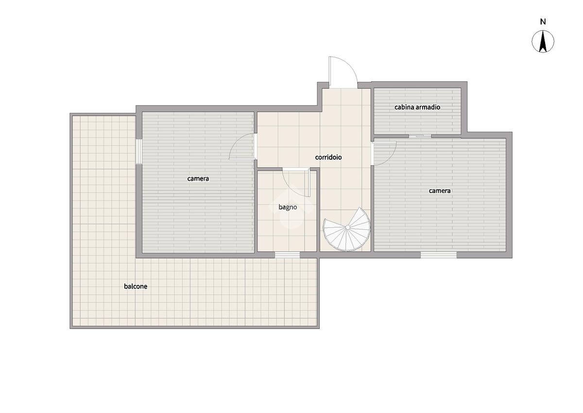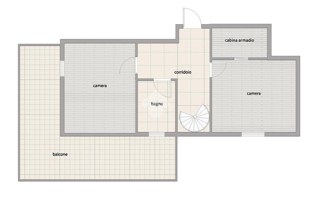Il primo piano è dedicato alla zona notte: una camera matrimoniale con cabina armadio, elegante e funzionale, una cameretta con balcone che si sviluppa su due lati della casa con esposizione EST e SUD e un bagno finestrato con box doccia che completa il piano con comfort e luminosità.