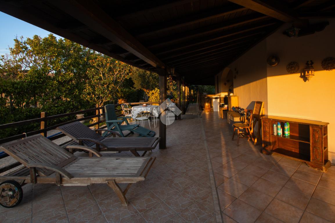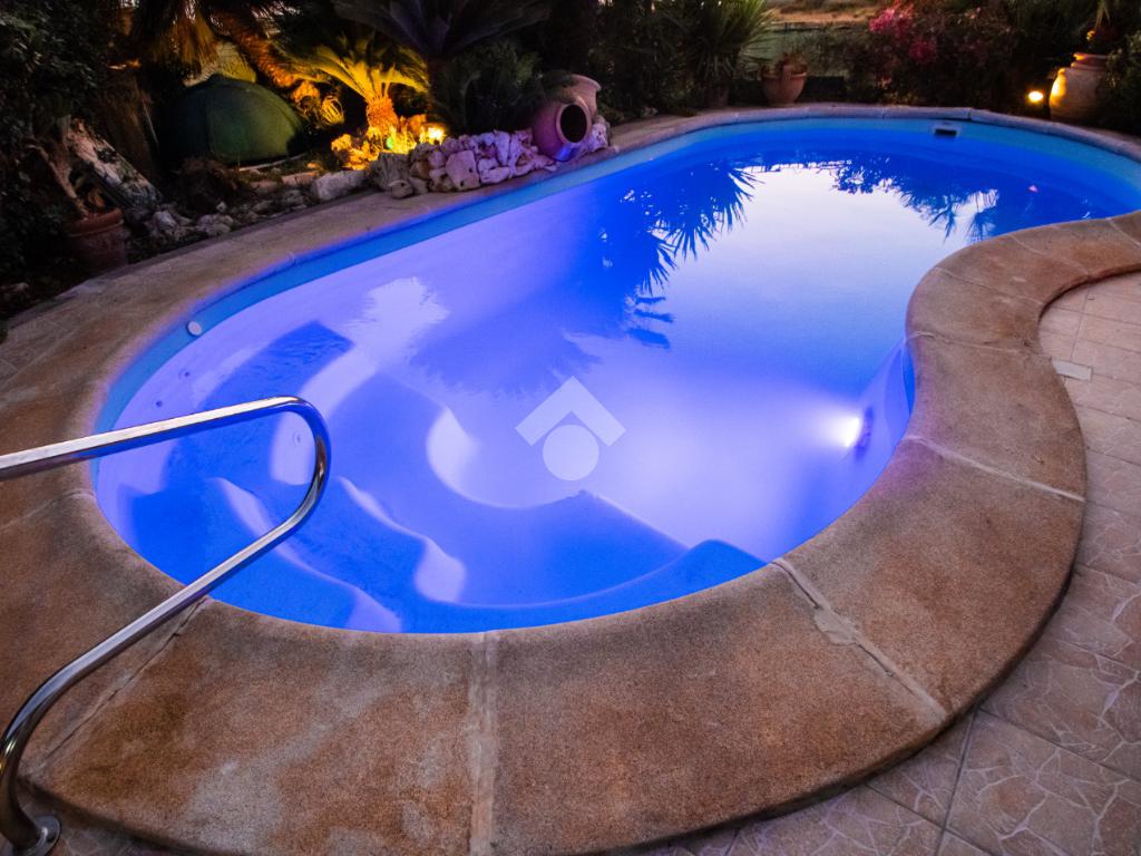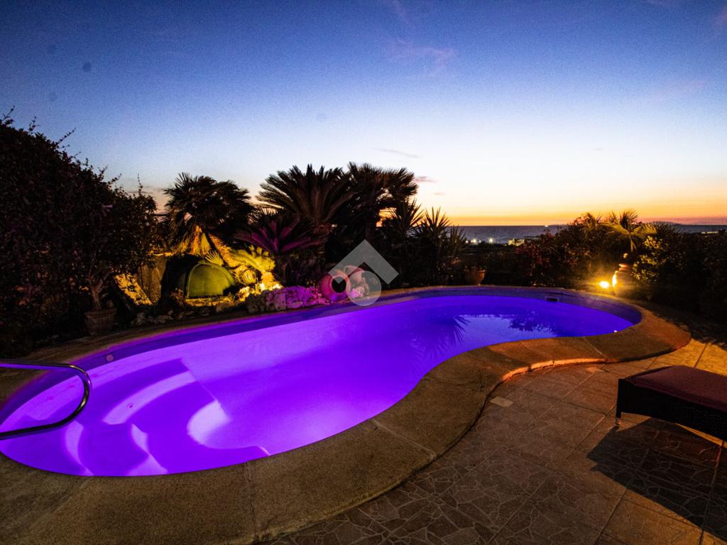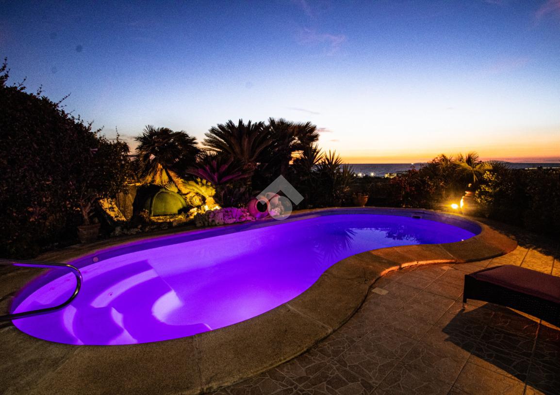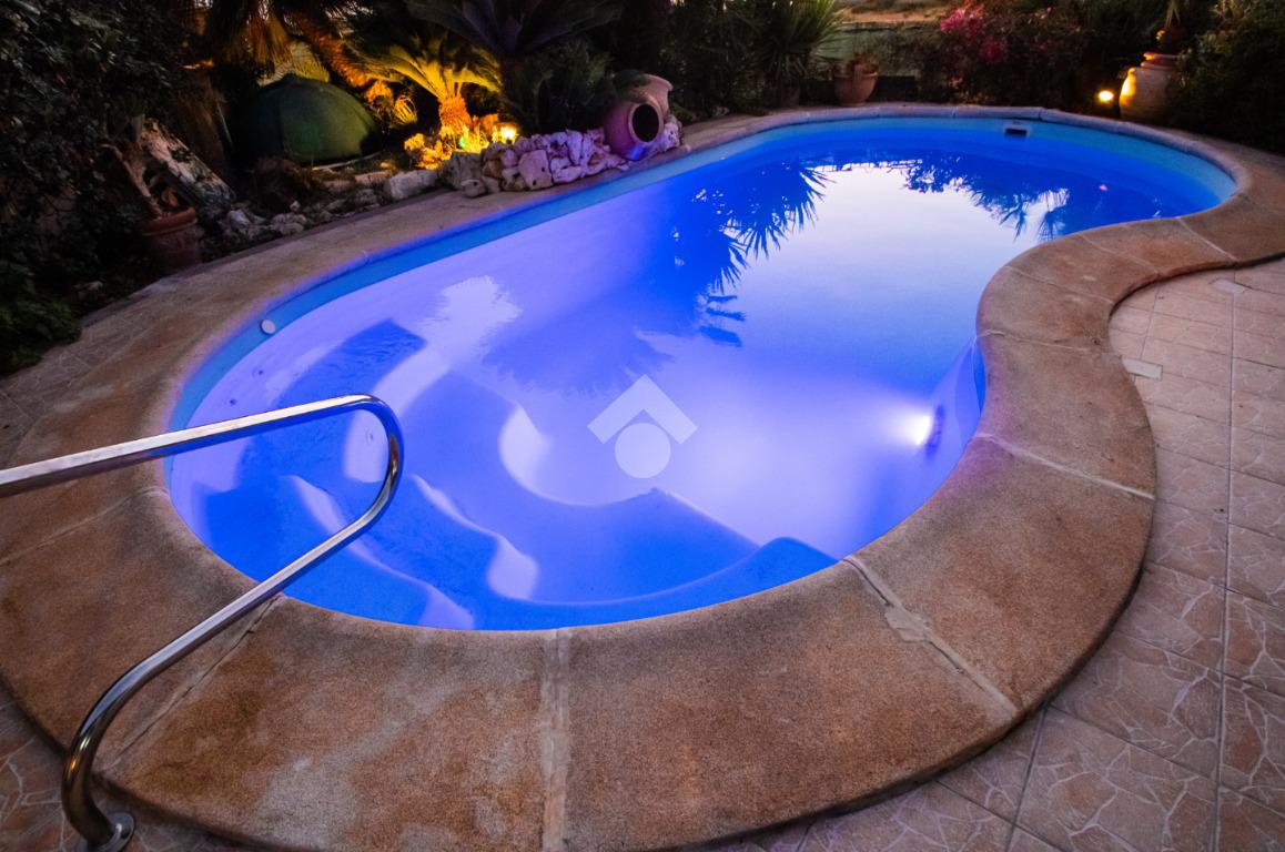 Dall’ingresso indipendente, carrabile e pedonale, si accede al giardino con piscina vista mare e portici sovrastati da una bellissima tettoia in legno a ferro di cavallo che copre i 3 lati della casa, corrispondenti a NORD – EST – OVEST. Il giardino presenta alberi e fiori da decoro e , per i buongustai, un angolo con barbecue e forno esterni. Il giardino è dotato di pozzo per l’irrigazione e il riempimento della piscina.