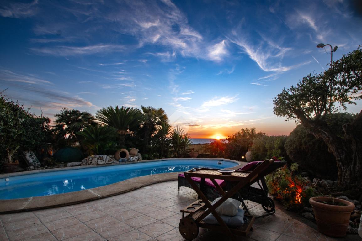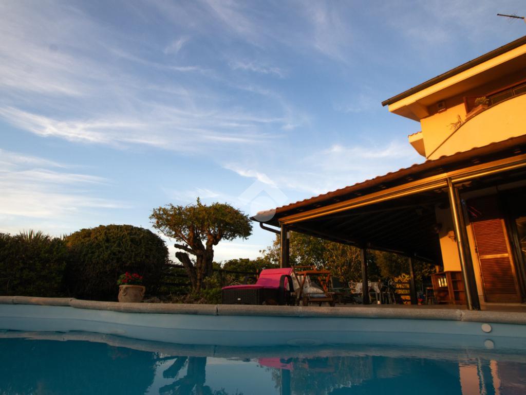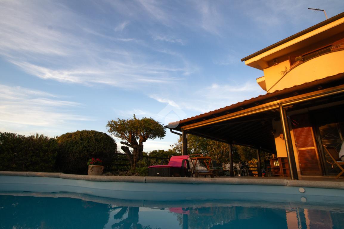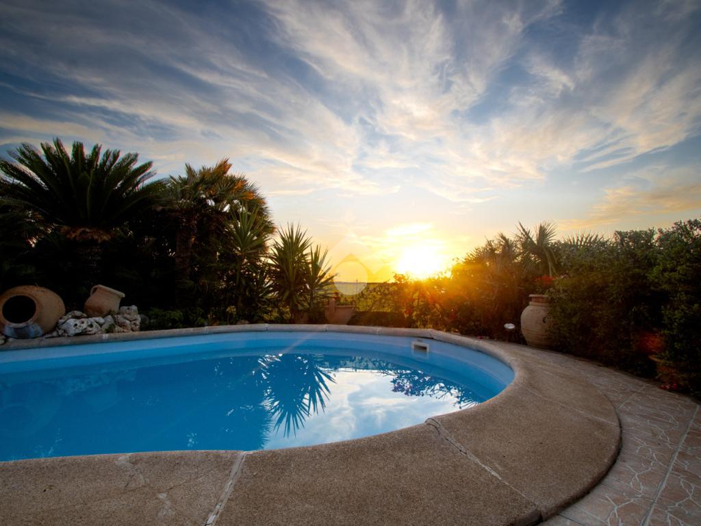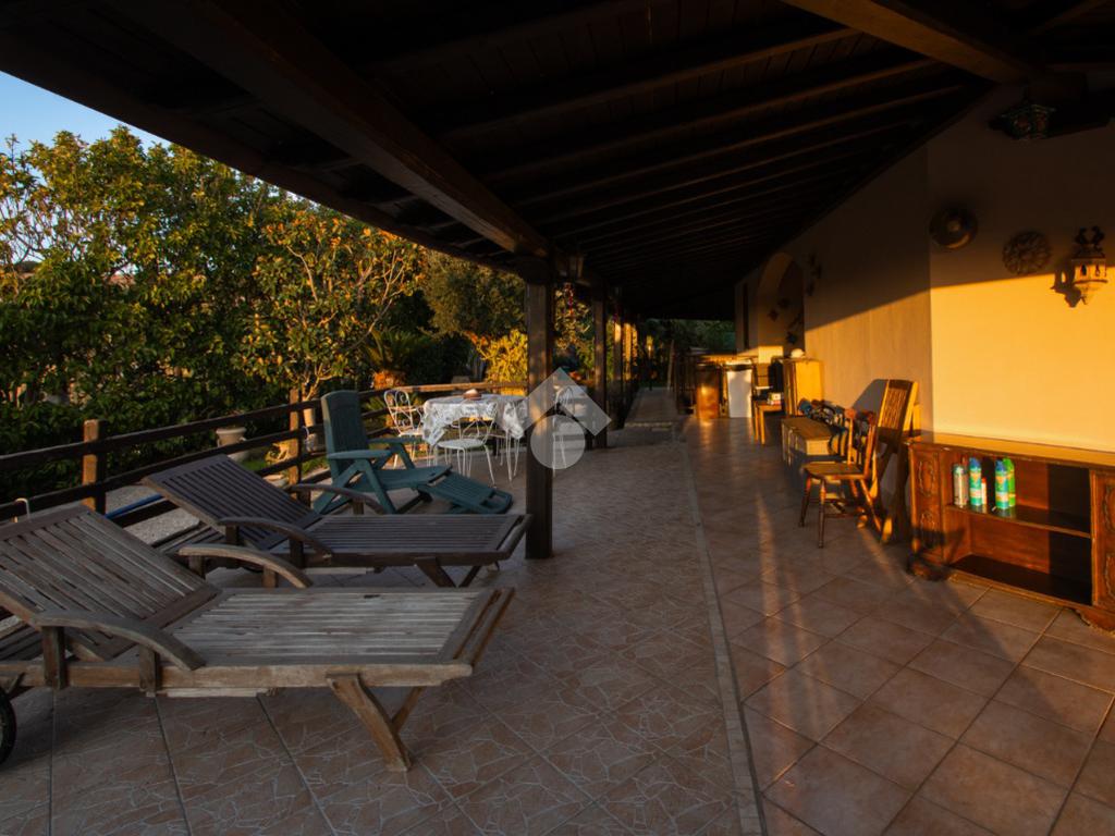 Dall’ingresso indipendente, carrabile e pedonale, si accede al giardino con piscina vista mare e portici sovrastati da una bellissima tettoia in legno a ferro di cavallo che copre i 3 lati della casa, corrispondenti a NORD – EST – OVEST. Il giardino presenta alberi e fiori da decoro e , per i buongustai, un angolo con barbecue e forno esterni. Il giardino è dotato di pozzo per l’irrigazione e il riempimento della piscina.